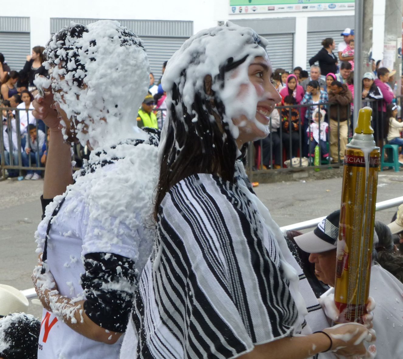 The official title is the Carnival de Negros y Blancos (Black and Whites Carnival) and it is meant to be a celebration of racial diversity (including native American although that isn't in the name). And, it is crazy. One of the customs is that everyone should be black and white during the carnival. So throughout the entire time people are spraying carioca foam on one another to make people white (see below for photos). Less common, except on the last day, they also throw talc, a very fine white earth. That's not so fun as the spray and I only had it directly thrown on me once. The next to last day (January 5) is the Dia de los Negros. On that day peope get black paint and paint one another's faces (and sometimes clothes) with black paint. Our tour took a side trip that day so we didn't experience that. But I did see some black-painted faces.