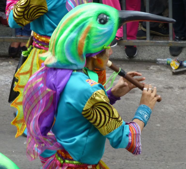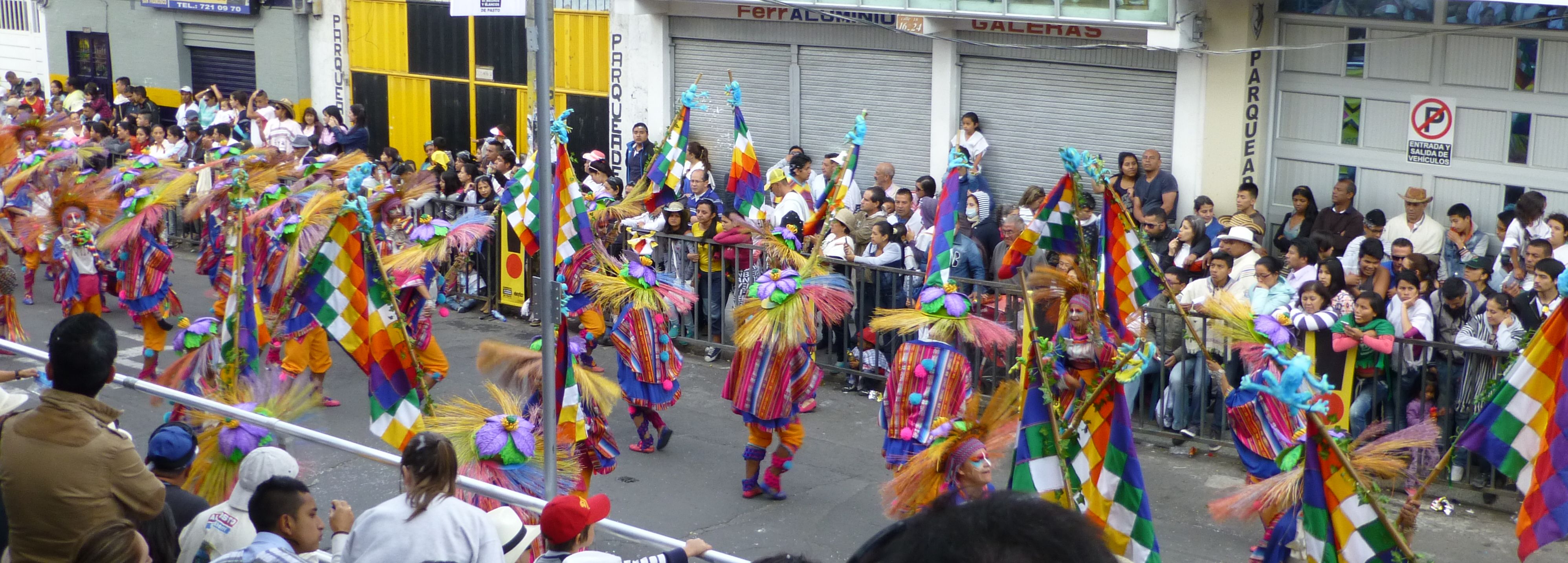 In today's parade about fifteen different groups (100 to 200 participants) perform Andean music and dance. This parade could be the main event in a major festival but here it is just a try-out. The two groups judged to be the best get to perform in the main parade on January 6.